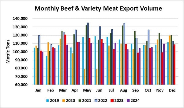 Mexico’s demand for US beef remained robust in November, with exports increasing 6% from a year ago to 18,914 mt, while value was up 4% to $107.4 million. January-November exports to Mexico reached 211,920 mt, up 12% year-over-year, while value jumped 14% to $1.23 billion. Both already exceed the full-year totals from 2023 and export value is the highest since 2009.